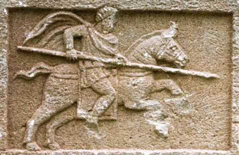 - über dem Schriftfeld Reiter (Soldat) im Galopp, Lanze in beiden Händen