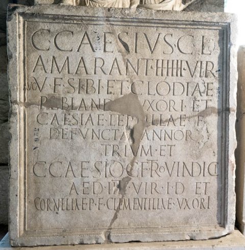 - C(aius) Caesius C(ai) l(ibertus) / Amarant(hus) IIIIIIvir / Aug(ustalis) v(ivus) f(ecit) sibi et Clodiae / P(ubli) l(ibertae) Bland[ae] uxori et / Caesiae Lepidillae / defunctae annor(um) / trium et / C(aio) Caesio C(ai) f(ilio) Tro(mentina) Vindici / aed(ili) IIIIvir(o) i(ure) d(icundo) et / Corneliae P(ubli) f(iliae) Clementillae uxori