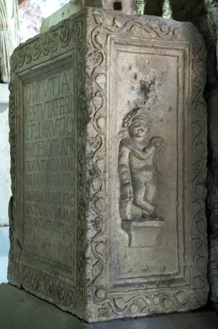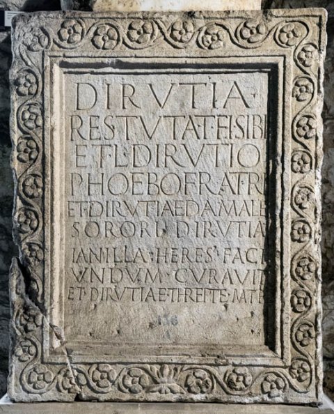 - Dirutia / Restuta t(estamento) f(ieri) i(ussit) sibi / et L(ucio) Dirutio / Phoebo fratri / et Dirutiae Damale / sorori Dirutia / Ianilla heres faci/undum curavit / et Dirutiae Threpte matri