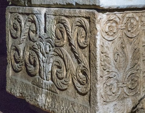 - Schriftfeld seitlich mit Blattkandelabern, oben mit Blattgirlande gerahmt. Seitenfelder mit lyraförmigem Akanthusornament mit Blüten. Im Schriftfeld unten ascia. Auf den Nebenseiten Akanthusranken.