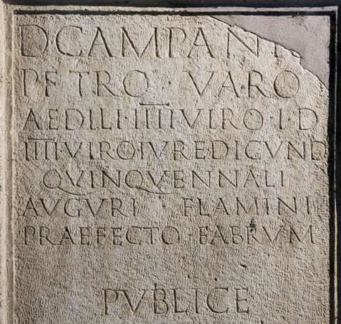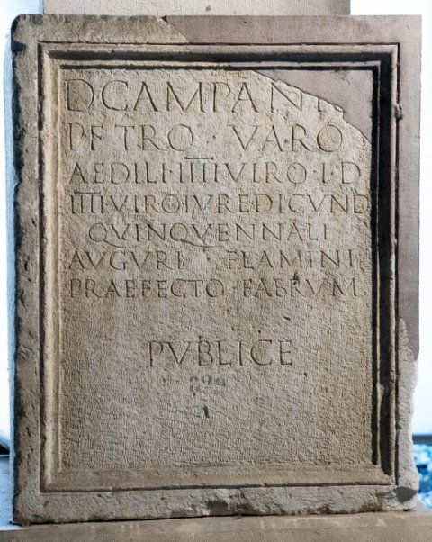 - D(ecimo) Campanio / P(ubli) f(ilio) Tro(mentina) Varo / aedili IIIIviro i(ure) d(icundo) / IIIIviro iure dicund(o) / quinquennali / auguri flamini / praefecto fabrum / publice