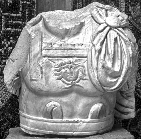 - Mann (Offizier, Kaiser ?) in Brustpanzer mit Gorgoneion, Feldherrenbinde, Mantelbausch auf der linken Schulter