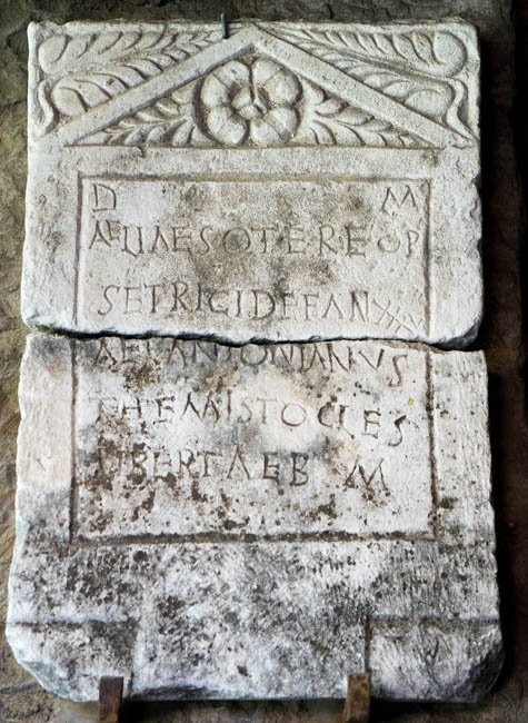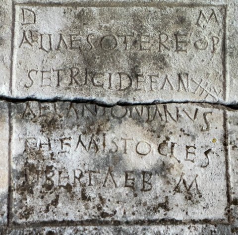 - D(is) M(anibus) / Aeliae Soter(a)e ob/stetrici def(unctae) an(norum) XXXV / Ael(ius) Antonianus / Themistocles / libertae b(ene) m(erenti)