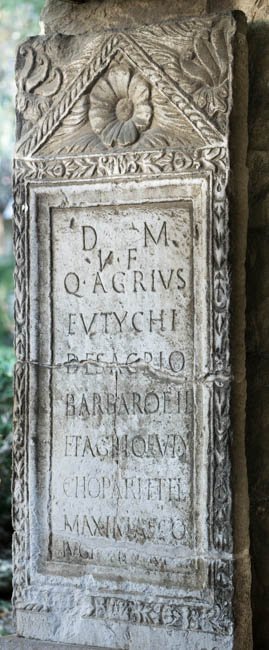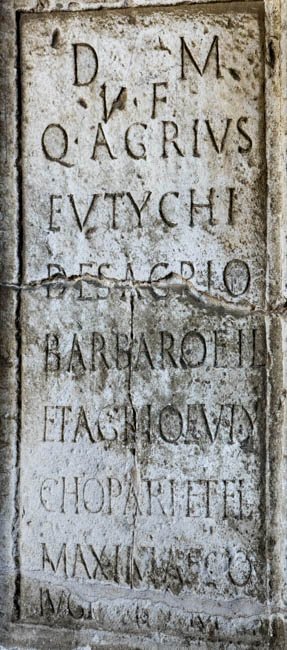 - D(is) M(anibus) / v(ivus) f(ecit) / Q(uintus) Agrius / Eutychi/des Agrio / Barbaro eil(io)! / et Agrio Euty/cho patri et Fl(aviae) / Maximae co(n)/iugi b(ene) m(erentibus)
