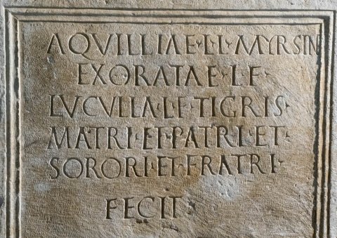 - Aquilliae L(uci) l(ibertae) Myrsin(a)e / Exoratae L(uci) f(iliae) / Luculla L(uci) f(ilia) Tigris / matri et patri et / sorori et fratri / fecit