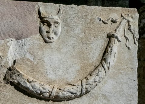 - über der Inschrift und auf den Nebenseiten Girlanden, in den Girlandenbögen vorn Maske mit Hörnern (Luna ? Acheloos ?), auf den Seiten Gefäße (links Kanne, rechts patera).