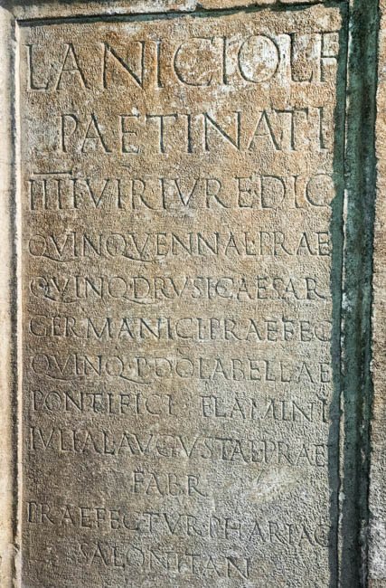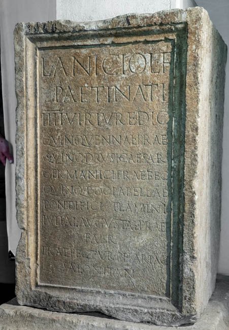 - L(ucio) Anicio L(uci) f(ilio) / Paetinati / IIIIvir(o) iure dic(undo) / quinquennal(i) prae(fecto) / quinq(uennali) Drusi Caesar(is) / Germanici praefec(to) / quinq(uennali) P(ubli) Dolabellae / pontifici flamini / Iuliae Augustae praef(ecto) / fabr(um) / praefectur(a) Phariac(a) / Salonitan(a)