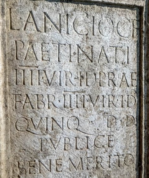 - L(ucio) Anicio C(ai) f(ilio) / Paetinati / IIIIvir(o) i(ure) d(icundo) prae(fecto) / fabr(um) IIIIvir(o) i(ure) d(icundo) / quinq(uennali) d(ecurionum) d(ecreto) / publice / bene merito
