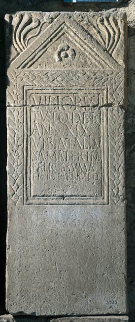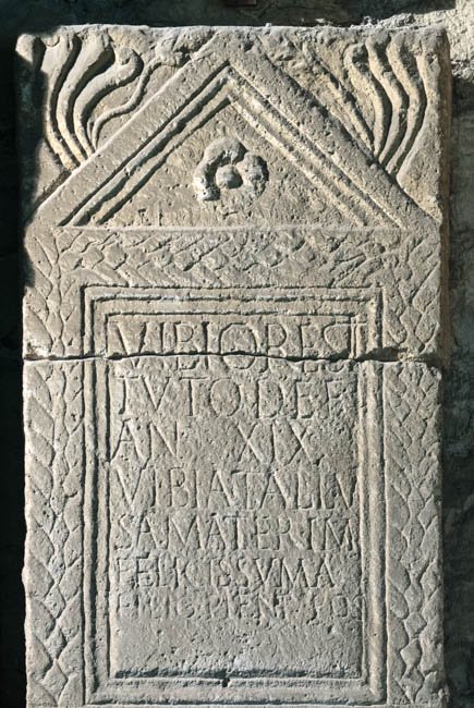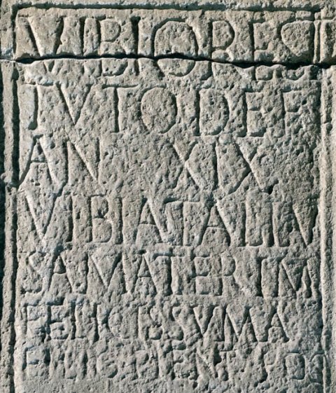 - Vibio Resti/tuto def(uncto) / an(norum) XIX / Vibia Tallu/sa mater imfelicissuma(!) / filio pient(issimo) pos(uit)