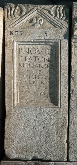 - P(ublio) Novio / Platoni / Menandri / lib(erto) / Philippus / Balbini / amico / b(ene) m(erenti)