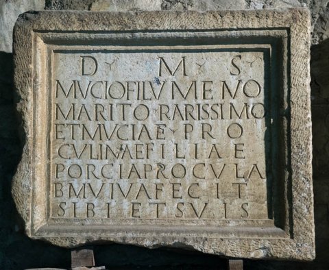 - D(is) M(anibus) s(acrum) / Mucio Filumeno(!) / marito rarissimo / et Muciae Pro/culinae filiae / Porcia Procula / b(ene) m(erenti) viva fecit / sibi et suis