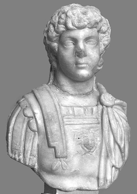 - Historische Person: Caracalla als Knabe (?) im Brustpanzer mit Gorgoneion und Mantelbausch mit Scheibenfibel auf der linken Schulter