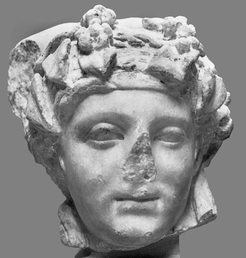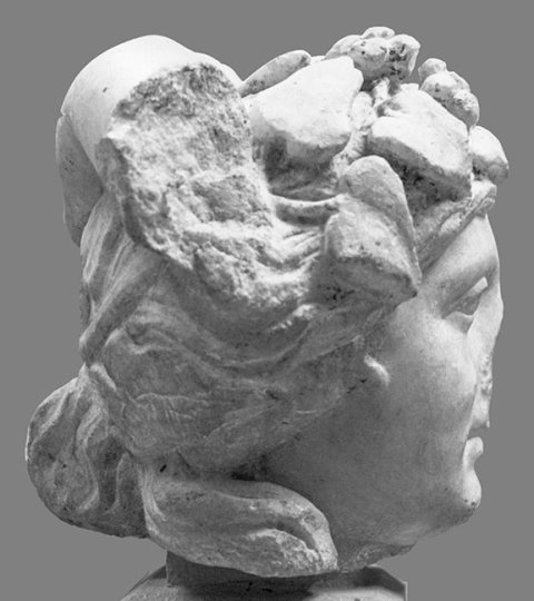 - Mythische Figur: jugendlicher angelehnter Dionysos mit Efeukranz, linker Arm über den Kopf gelegt.