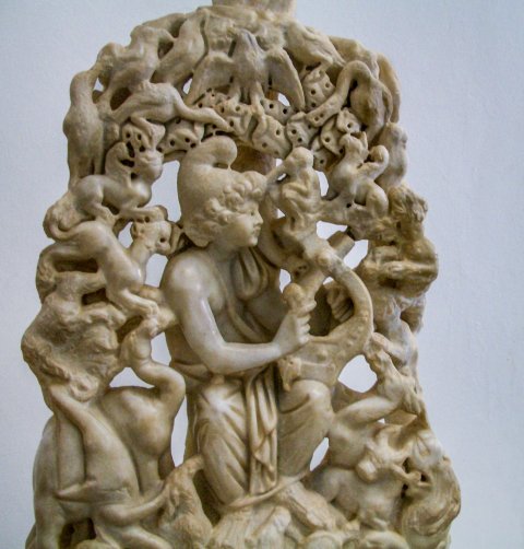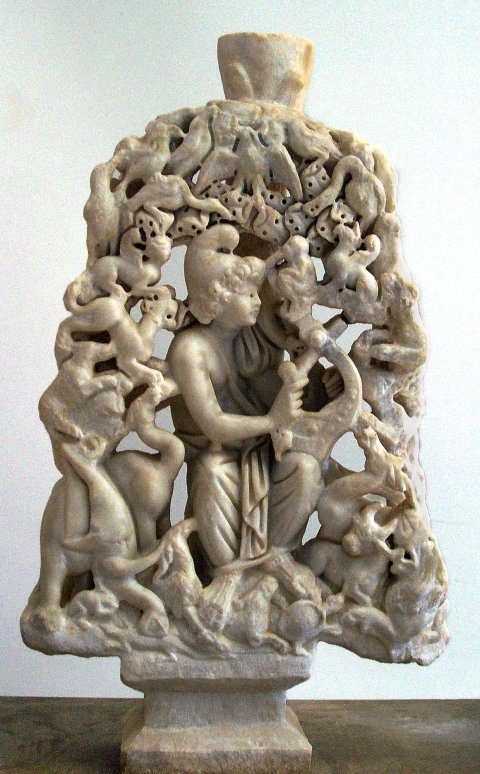 - Mythos: unter einem Baum sitzender Orpheus mit Lyra und phrygischer Mütze, ringsum Tiere. Oben Aufsatz mit Öffnung. Kandelaber ?