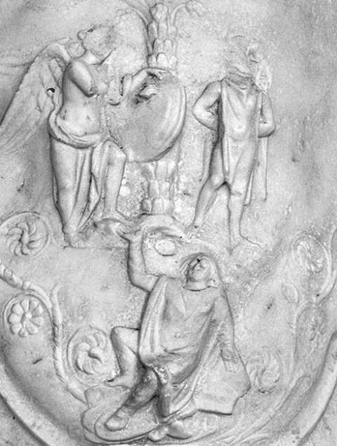 - Historische Person: Kaiser Vespasian oder Titus mit hohen Militärsandalen und Brustpanzer mit Reliefs (Gorgoneion, darunter Victoria, auf einem Schild schreibend, dahinter Palme, rechts stehender, unten auf Schilden sitzender Gefangener). Neben dem rechten Bein Palmstammstütze.