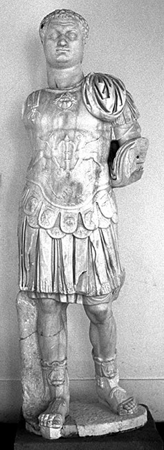 - Historische Person: Kaiser Titus in hohen Militärsandalen und Brustpanzer mit Reliefs (Kandelaber zwischen zwei Greifen)