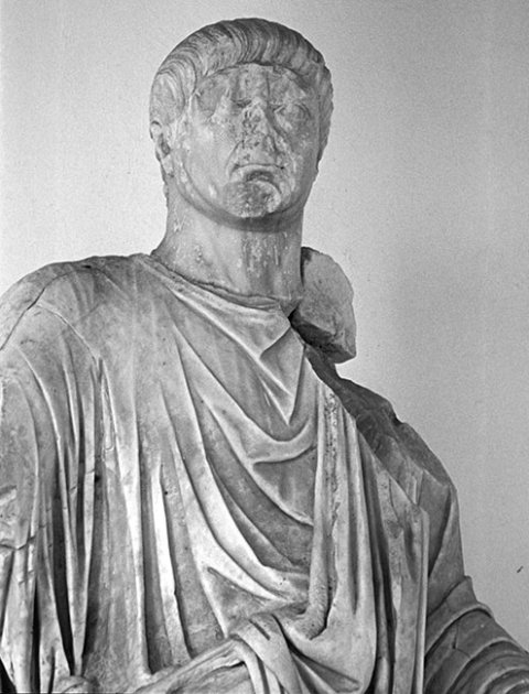 - Kopf eingesetzt, stark bestoßen. linke Schulter tlw. abgebr., rechter Unterarm u. linke Hand, rechter Fuß u. linker Vorderfuß abgebr.