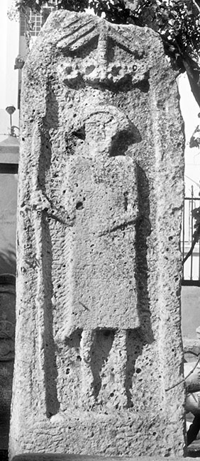 - Stehender Mann in halblangem Gewand, in der Rechten Speer. Darüber Reihe von Rosetten und Palmzweig (?).
