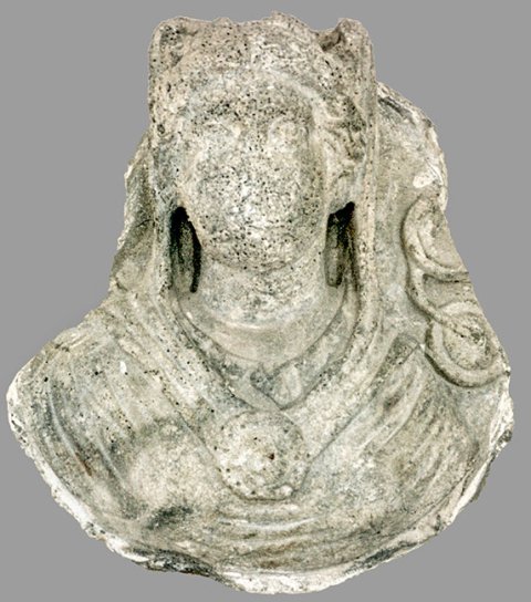- Bekleidete Büste einer Frau mit Schleier, über den Schultern breites Band mit runder Scheibe. Über der linken Schulter zwei Ringe (?).