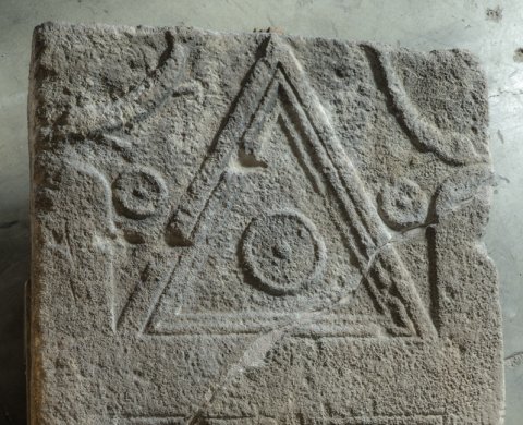 - Im eingeschriebenen Giebel Rosette, auf den Schrägen Rosetten und Delphine.