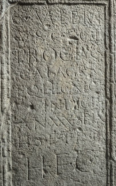 - C(aius) Valeri/us C(aii) f(ilius) Gal(eria) / Proculus / Calagurr(i) / eq(ues) leg(ionis) XI C(laudiae) f(idelis) / (centuria) Vindicis / an(norum) XXX stip(endiorum) IX / h(ic) s(itus) e(st) t(estamento) f(ieri) i(ussit) / h(eres) f(aciendum) c(uravit)