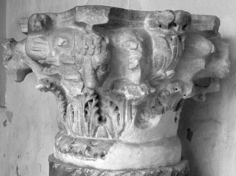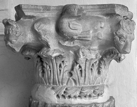 - Kapitell mit Akanthusblattkranz, darüber Löwenköpfe und Adler