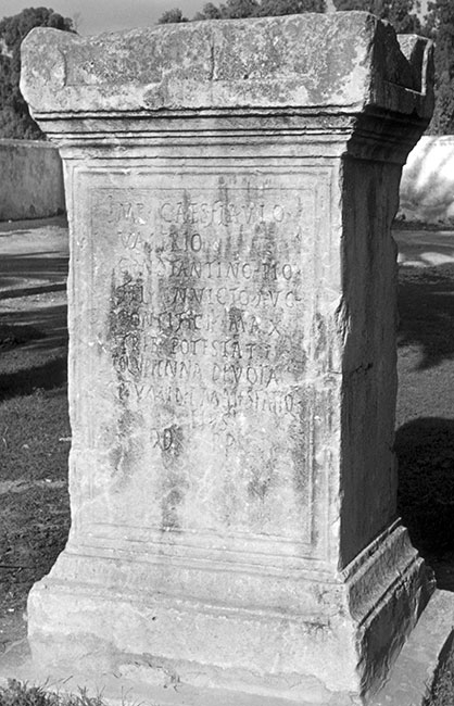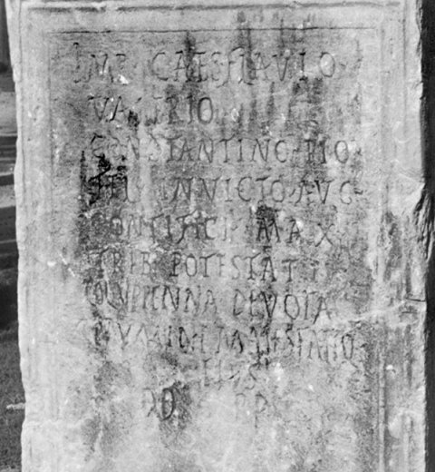 - Imp(eratori) Caes(ari) Flavio / Valerio / Constantino Pio / Fel(ici) Invicto Aug(usto) / pontifici max(imo) / trib(unicia) potestate / col(onia) Uppenna devota / numini maiestatiq(ue) / eius / d(ecreto) d(ecurioum) p(ecunia) p(ublica)
