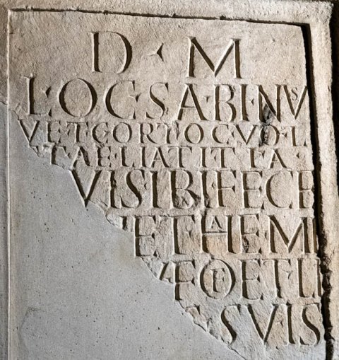 - D(is) M(anibus) / L(ucius) Oc(tavius) Sabinus / vet(eranus) co(h)ort(is) oc(tavae) vol(untariorum) / [e]t Aelia Titia / [vi]vi sibi fece/[r]u(nt) et Haemi/[lio! R]ufo f(ilio) et li/[berti]s suis