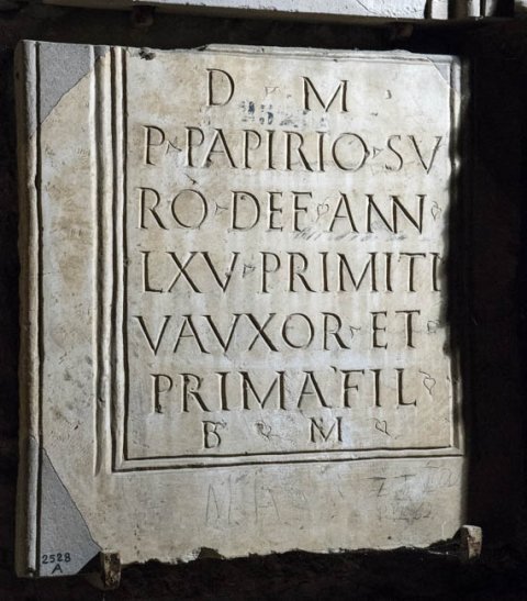 - D(is) M(anibus) / P(ublius) Papirio Su/ro def(uncto) ann(orum) / LXV Primiti/va uxor et / Prima fil(ia) / b(ene) m(erenti)