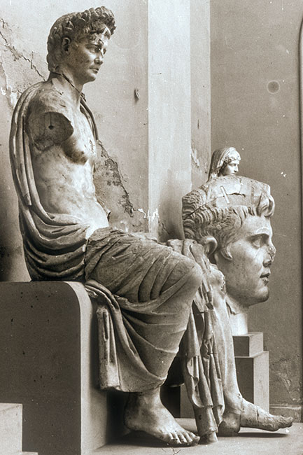 - Historische Person: thronender Kaiser Claudius mit Lorbeerkranz.