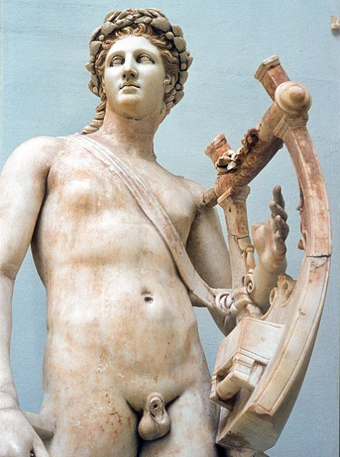 - Mythische Figur: nackter Apollo mit Lorbeerkranz und Kithara, neben dem linken Bein Baumstammstütze.