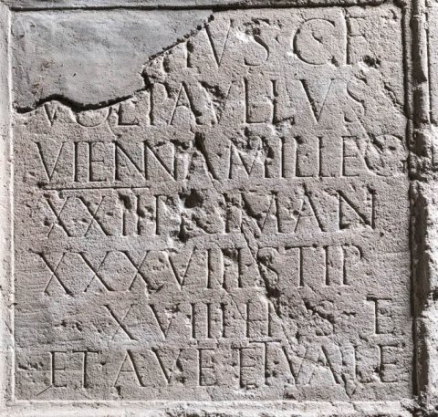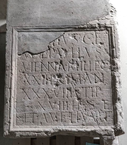 - [C(aius) Rit]tius C(ai) f(ilius) / Vol(tinia) Paullus / Vienna mil(es) leg(ionis) / XXII Prim(igeniae) an(norum) / XXXVIII stip(endiorum) / XVIII h(ic) s(itus) e(st) / et ave et vale