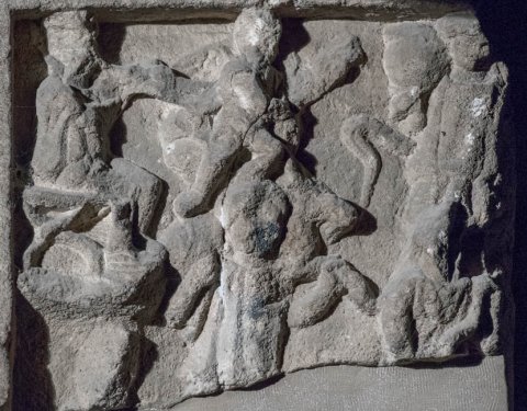 - Mythische Figuren: links oben auf Klappstuhl sitzende Figur, davor nackter Knabe, darunter Figur mit geschultertem Bock, rechts oben Mann mit Weinschlauch, darunter Frau (?) mit Schlange (?). Dionysische Szene (Geburt des Dionysos ?).