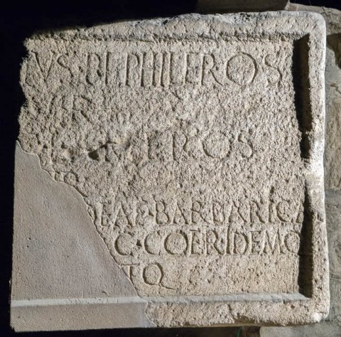 - [---]ius P(ubli) l(ibertus) Phileros / [se]vir / [---] l(ibertus) (H)imeros / [sev]ir / [---] deae Barbaricae / [sua pecunia f]ac(iendum) coer(averunt) idemq(ue) / [dedicaverunt? probaverun]tq(ue)(?)