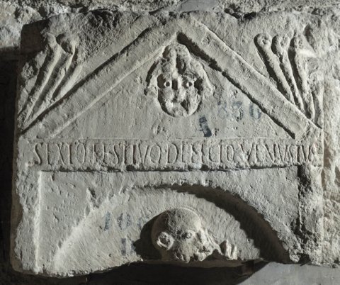 - eingeschriebener Giebel mit Theatermaske, Seitenakrotere. Bogennische mit Kopf eines Kindes (Knabe)