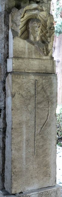 - Rundbogiger Abschluss mit Muschelnische, darin Büste eines bartlosen Mannes. Unterhalb der Inschrift Waffen (Bogen und Pfeil) und langer Stab.