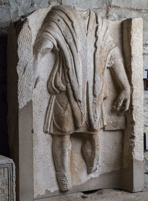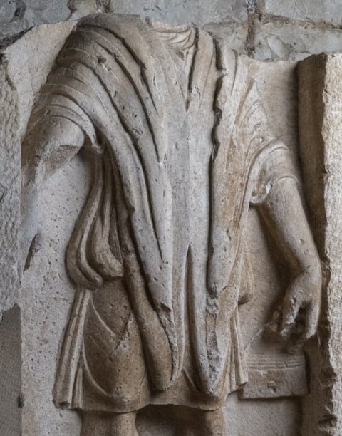 - Ganzfigur eines Mannes (Soldat, Centurio) in Tunica, Paenula und Schuhen, in der Linken zusammengeklapptes Polyptychon.