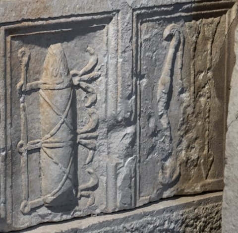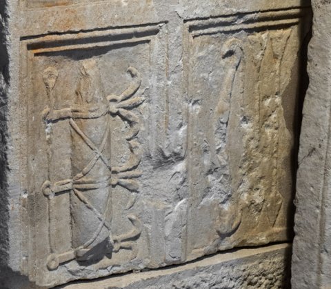 - Türrelief mit vier Feldern, oben ringförmige Türklopfer mit Palmettenattasche. Unten Waffen (links Köcher, rechts Bogen und zwei Pfeile).