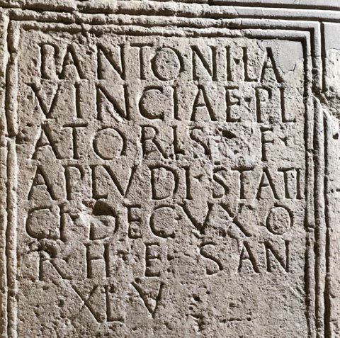 - Pantoni La/vinciae Pl/atoris f(iliae) / Apludi Stati/ci dec(urionis) uxo/r(i) h(ic) e(st) s(ita) an(norum) / XLV