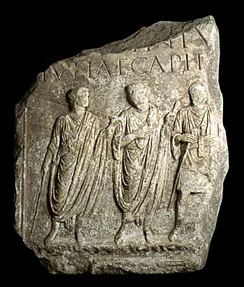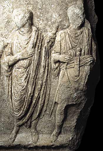 - Unterhalb der Inschrift links Lictor in Toga, schultert mit der Linken die fasces (Rutenbündel), in der Rechten Stab. In der Mitte Togatus, Rolle (volumen) in der Linken. Rechts Scriba in kurzer Tunica und Mantel, in der Rechten Stab, im Überschlag des Mantels vor der Brust Schreibzeug (Etui für Stili). Rechts folgten eine sella curulis und weitere Amtsdiener.