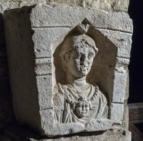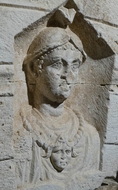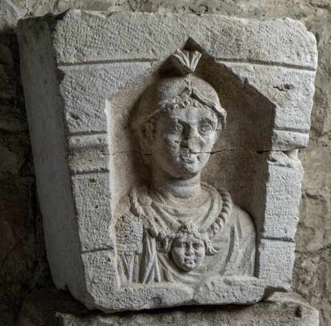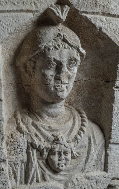 - Mythische Figur: Keilstein des Stadttores mit horizontaler Gliederung, Nische mit Giebelabschluss, darin Büste der Roma (Minerva ?) mit Helm und Torques mit Gorgoneion.