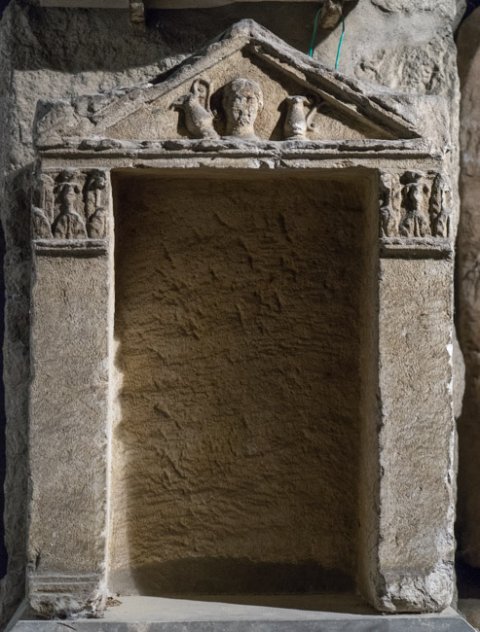 - hinten grob zugehauen u. abgerundet, Boden oder Sockel fehlen, Akrotere abgebr.