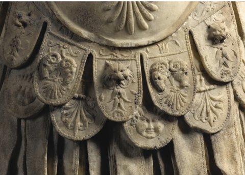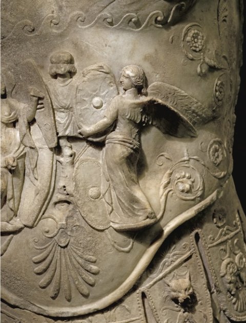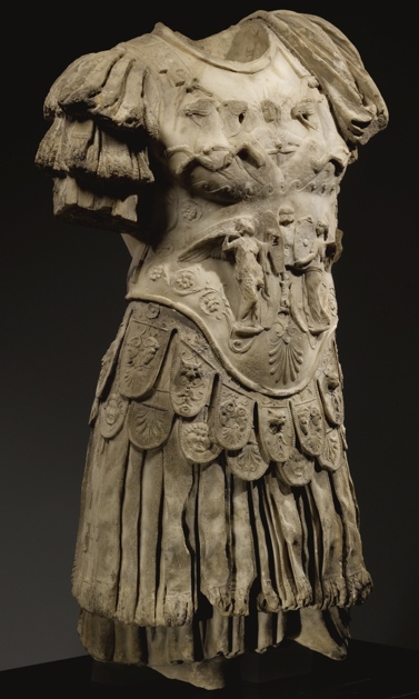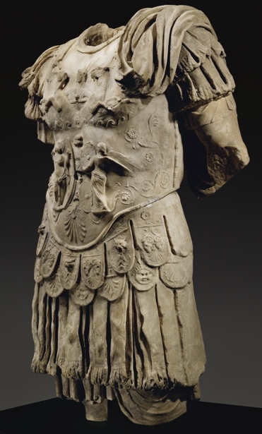 - Historische Person: Panzerstatue eines Kaisers. Reliefs auf dem Brust: oben Sol mit Viergespann, darunter zwei Victorien, die Schilde an ein Tropaion hängen. Unten Palmette, seitlich Ranken. Zwei Reihen von Pteryges mit Reliefs.