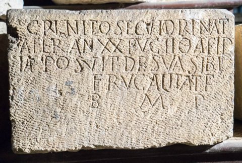 - D(is) M(anibus) // Crinito secutori nat(ione) / Afer an(norum) XX pug(narum) II (obito) Afid/ia posuit de sua sibi / frugalitate / b(ene) m(erenti) p(osuit)