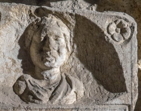 - Über dem Schriftfeld rahmenlose Bo9gennische mit Büste eines Kindes (Knabe) im Sagum mit Scheibenfibel. Seitlich je eine Rosette.