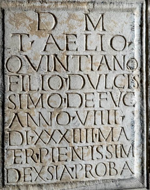 - D(is) M(anibus) / T(ito) Aelio / Quintiano / filio dulcis/simo def(un)c(to) / anno(rum) VIIII / di(erum) XXXIIII ma/ter pientissima / Dexsia(!) Proba