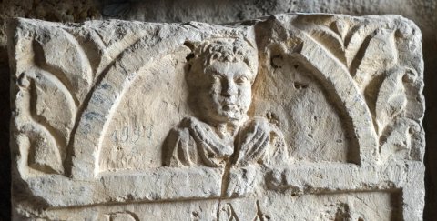 - Über dem Schriftfeld gerahmte Bogennische mit Büste eines Mannes im Sagum, seitlich Blattdekor.