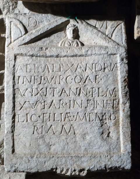- D(is) M(anibus) // Ael(iae) Alexandriae / inf(e)l(icissimae) virg(ini) q(u)ae / vixit ann(os) pl(us) m(inus) / XV par(entes) inf(elicissimi) infe/lic(issimae) filiae memo/riam