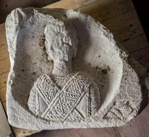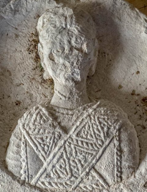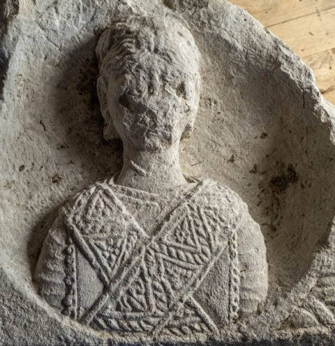 - Linker Akroter eines Sarkophagdeckels mit runder Aushöhlung, darin Büste einer Frau mit Scheitelzopffrisur, Halskette, Ohrgehängen und über der Brust gekreuzten ornamentierten Bordüren. Rechter Akroter mit stark zerstörter männlicher Büste mit Zwiebelknopffibel. Bei beiden Akroteren setzt unten eine den Rand des Sarkophagdeckels begleitende Girlande an.