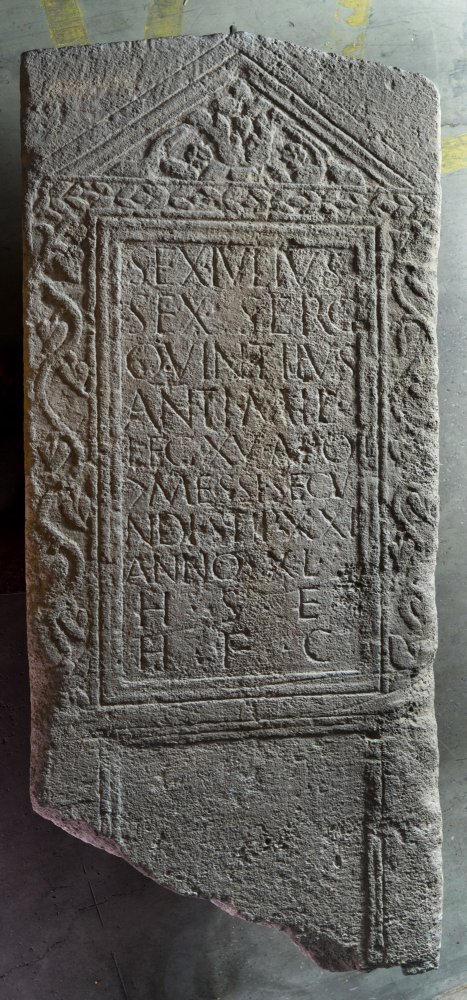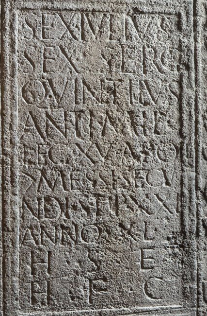 - Sex(tus) Iulius / Sex(ti filius) Serg(ia) / Quintilus / Anti(ochia) mil(es) / leg(ionis) XV Apo(llinaris) / (centuria) Messi(i) Secu/ndi stip(endiorum) XXI / anno(rum) XL / h(ic) s(itus) e(st) / h(eres) f(aciendum) c(uravit)